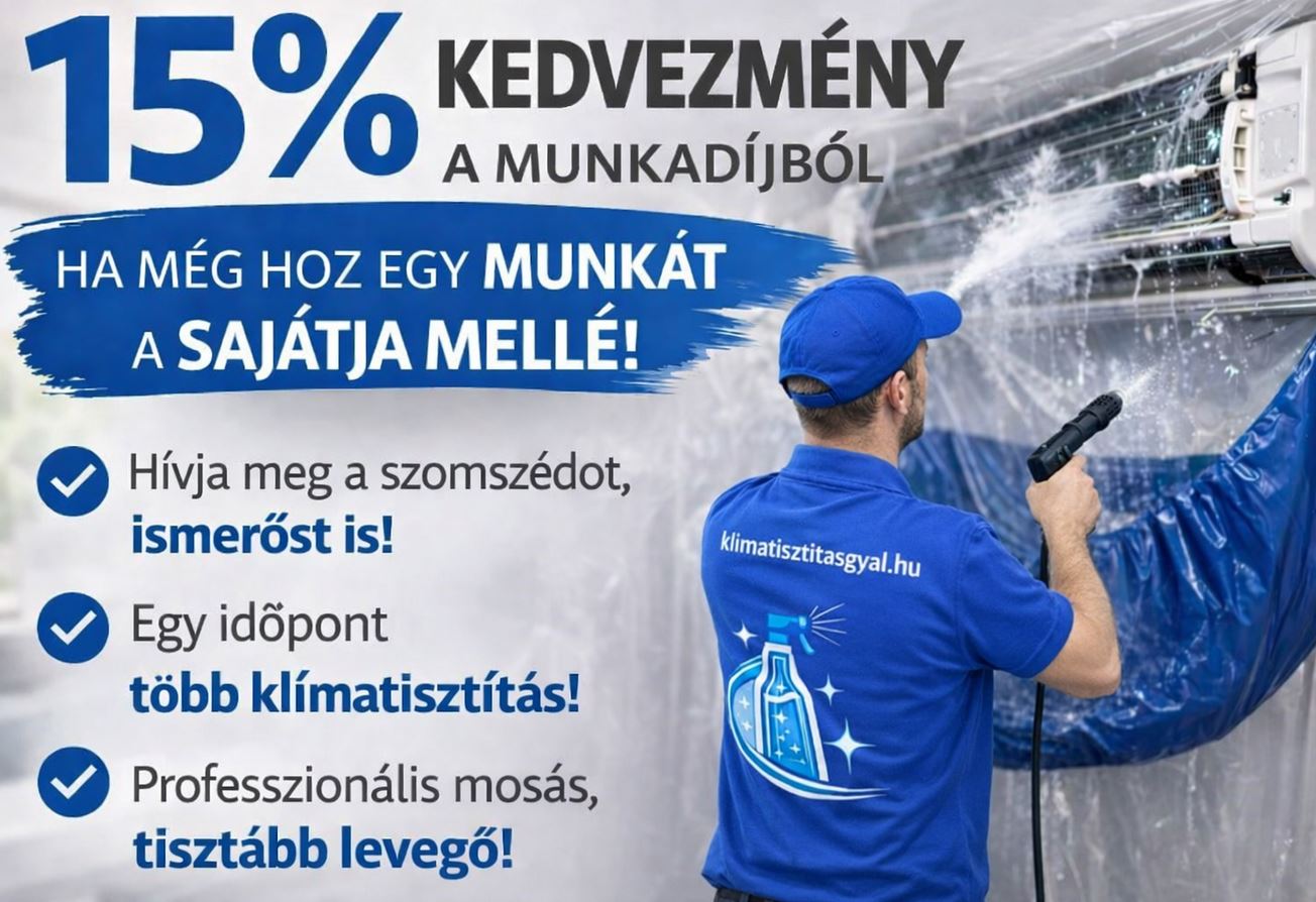 Ez a megoldás mindenkinek előnyös. A megrendelők kedvezményes áron kapják meg a professzionális klímatisztítást, mi pedig egy időpontban több berendezést tudunk karbantartani ugyanazon a helyszínen. Gyakran előfordul, hogy egy családi házban, ikerházban vagy társasházban több lakásban is szükség van klímatisztításra, ezért érdemes megkérdezni a szomszédokat vagy ismerősöket is.